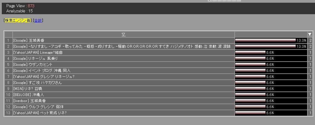 × [PR]上記の広告は3ヶ月以上新規記事投稿のないブログに表示されています。新しい記事を書く事で広告が消えます。 もう8月の半ばだというのに今更6月のアクセス解析を...どんだけ更新が遅いんだと(苦笑)。解析しようと思ったけど大して何にも書くことがないな・・・アクセスがいかに少ないかということを示しているとしか(’д‘)。 6月はグレシアのアップデートを控えていたので、グレシア関係の情報を求めてのアクセスがあったみたいです。あとウザンカのイベントのヒント・・・ウザンカイベントは週報のほうで取り上げていたので、お役に立てたのではないかと思います。。。ペット弱体化の情報に関してはまったく取り上げてません>< でもグレシアでもウルフかなり強いですよ!(汗) Lineage?組曲ってニコニコ動画で歌ったやつのことでしょうか...色々ごめんなさいとしかいえないwwwww そんな感じで、今更な上に大していいことも書いてない6月のアクセス解析結果でしたとさ~(逃 PR 店名:山原そば(やんばるそば) 場所:本部町伊豆味70-1 営業時間:11:00~16:00 定休日:月曜日・火曜日 TEL:098-047-4552 お勧め度:★★★★★ 【コメント】 名護の通称『そば街道』にある名店。ぱっと見は昔ながらの細々と経営しているお店といった感じで、メニューも三枚肉とソーキの二種類のみ。しかしその味が絶品で行く度に満員御礼、画像のように順番待ちすることもしばしばというまさに通のお店。特にソーキが柔らかくてお勧めですよ(^-^) 以前は月曜日のみ定休日だった(と思う)のですが、いつの間にか火曜日も定休日になっていました(>_<) 若干距離はありますが、同市内にちゅら海水族館もあるので観光の際には是非立ち寄ってみて欲しいです\(^-^)/ 店名:Pao room cafe(パオ ルーム カフェ) 場所:宜野湾市上原1-10-3 営業時間:11:30‐翌3:00 定休日: TEL:098-892-6089 お勧め度:★★★★☆ 【コメント】 宜野湾市上原にあるパン屋さん『Pao』の姉妹店になる喫茶。美味しいパンとゆったりとした空間が売りで、2~4人で行くのがお勧めです。味は文句なく美味しいのですが、値段の割に量が少なめなので男性には食べたりないかもしれません(笑)。14:30まではバイキングスタイルのランチメニューが用意されているらしいので、男性にはその時間に行くことをお勧めします。 ちなみ僕が頼んだ品物はBLTサンド。割と味音痴を自負する僕でも違いがわかるくらい美味しかったです(笑)。
