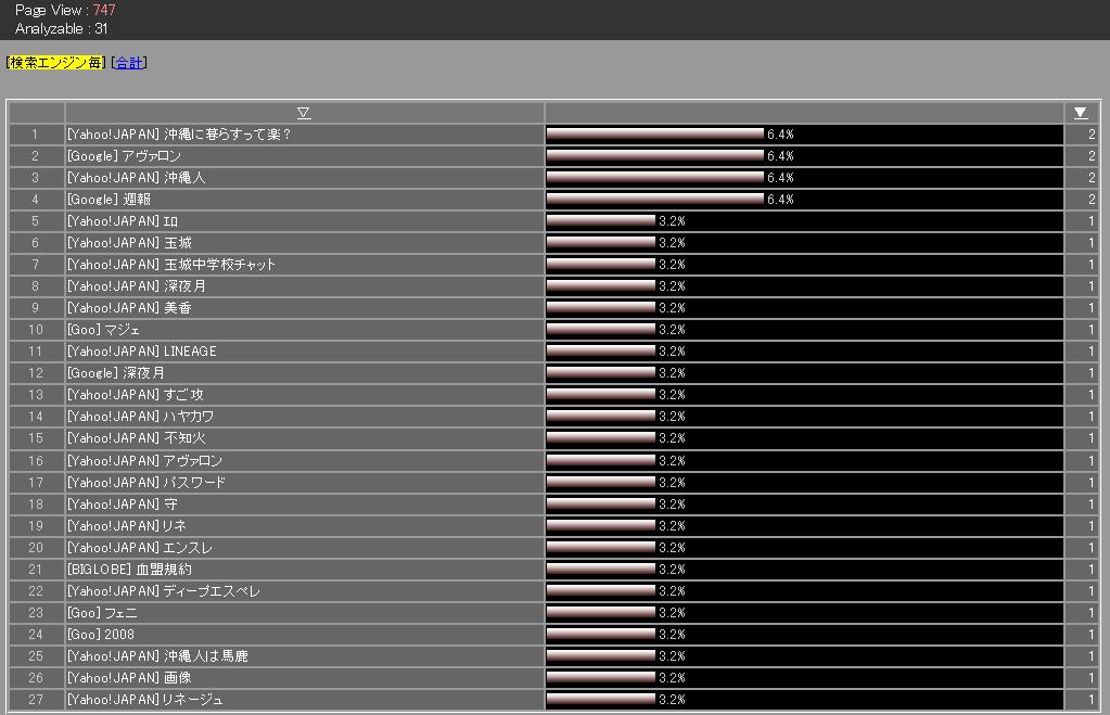 × [PR]上記の広告は3ヶ月以上新規記事投稿のないブログに表示されています。新しい記事を書く事で広告が消えます。 ■5月アクセス解析■ 一応 検索した人が残念がらないように、各キーワードに適した記事なんかが書けるといいなーという思惑もあります!(タブンネ。ちなみに今アクセス解析を置いているのはメインサイト、ブログ、週報の三つ。 (たしかファンフィクションコンテストの作品にも一個置いてる) ということで右側がキーワードなのですが、週報へのアクセスが一番多いこともあって「すご攻」などリネージュに関連するワードでの検索が多いみたいです。あとは「沖縄で暮らすって楽?」など沖縄関連のワードもちらほらと・・・ ちなみに沖縄で暮らすのはそんなに楽じゃないです。理由は地価が安いけど給料も安いから(笑)。ボーナスが出ない会社も多いですからねっ!(うちの会社も出ないorz)でも本州に比べるとのんびりとした感じだと思います。みんなてーげー(適当)だしね!w キーワードの中で明らかに関係のなさそうなのはNo.7。「玉城中学校チャット」。何でこのワードで検索されてるんですかね^^;「沖縄人は馬鹿」とかひでぇwwwwまぁ僕に限って言えば当たっているけどさwwwえーっと・・・・まとめるとですね・・・ 検索で僕のサイトに来られた方は 『みんな残念がってる』 ということかorz PR